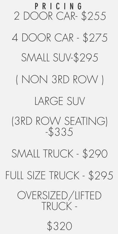 Our Standard Gold Exterior Only (which we perform the UPgraded Professional Strength Claybarring & Sio2 Based Ceramic Sealant) prices are as follows (Remember these INclude tax for PERSONAL vehicles within 30 miles of Marietta, OH - See SERVICE AREA For More Info):